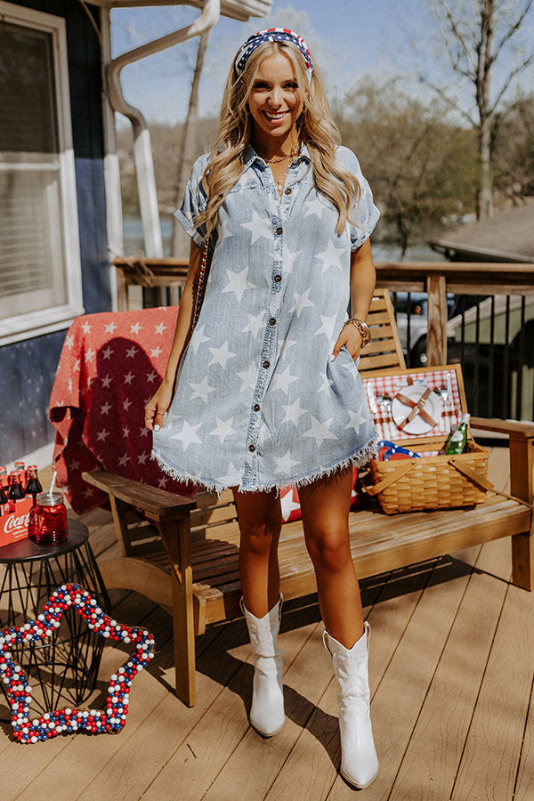 You 'glow' girl! This adorable dress features lightweight light wash chambray material patterned with white stars, a button down front with a collared neckline, short sleeves with rolled cuffs, hidden side pockets, and a relaxed silhouette that falls into a rounded frayed trim mid-thigh length hemline! on products