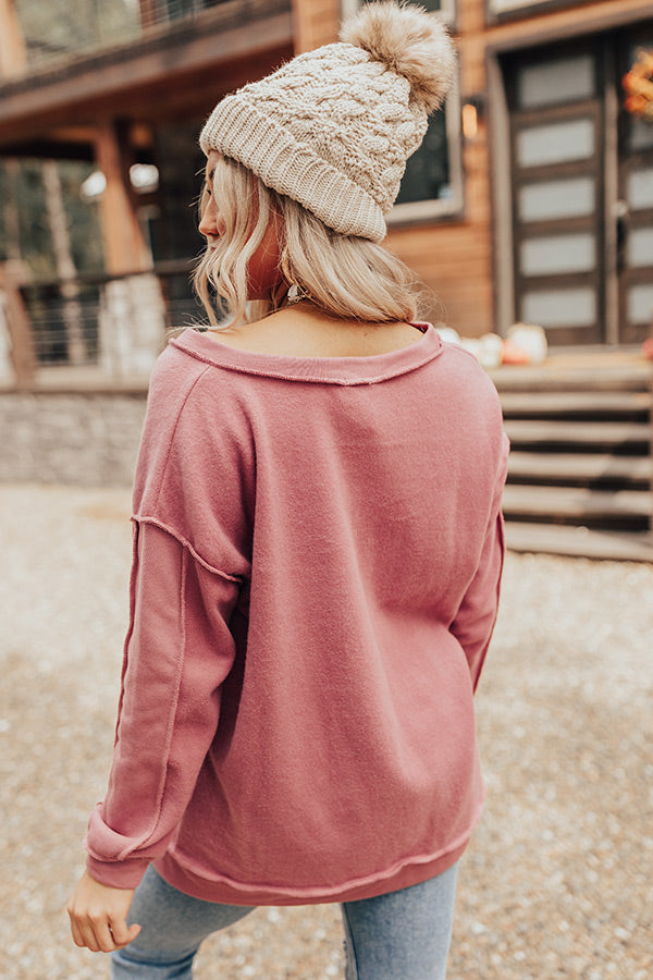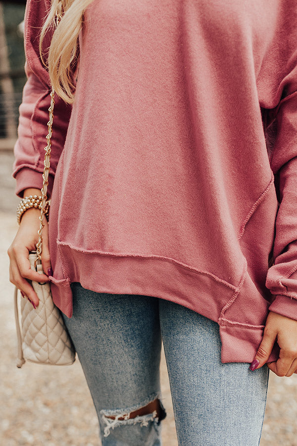 Ward off that sundown chill in style with this casual cute blush colored sweatshirt featuring soft material, a rounded v-cut neckline, long loose sleeves, exposed accent seams, wide trim, and a slouched silhouette that ends in an uneven hemline!