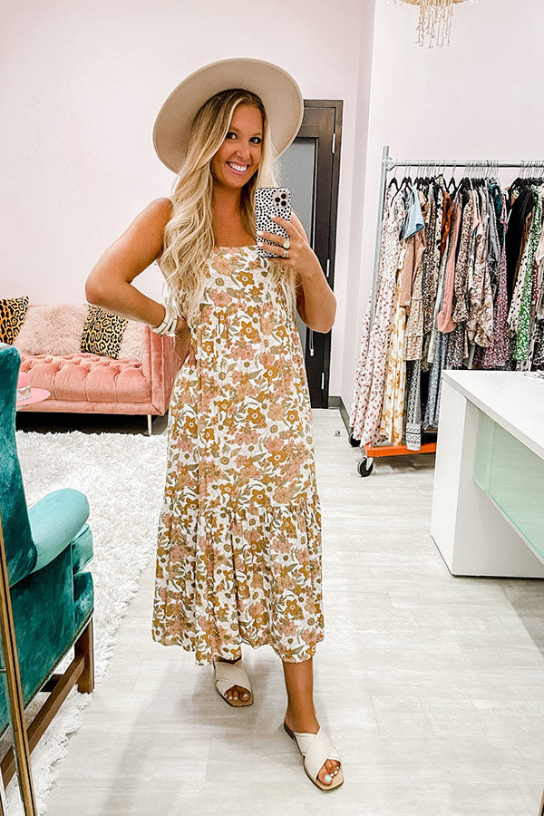 Twirl into the final days of summer with our adorable 'Sweet Intentions' midi dress featuring lightweight flowy material pattered with a mustard and light brown hued floral print, straight neckline and upper back with thin adjustable shoulder straps, and a relaxed silhouette that falls into a straight mid-calf length hemline! Measurements