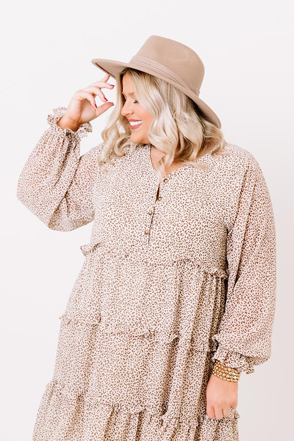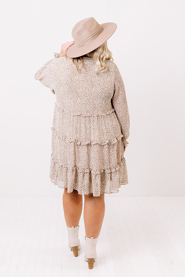 Plus Size - Sweeten up you wardrobe with this charming birch colored shift dress featuring lightweight and flowy material patterned with a small white spotted print, a button up bodice with a v-cut neckline, long loose bishop sleeves with flared elastic band cuffs, ruffled exposed accent seams, and a relaxed tiered silhouette that cascades into an uneven mid-thigh length hemline!