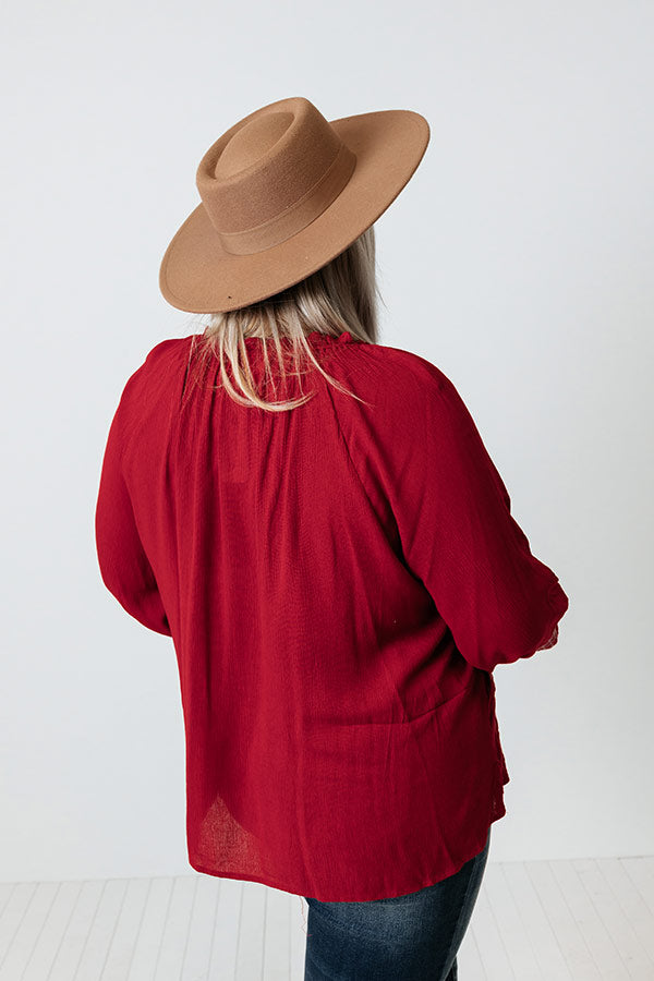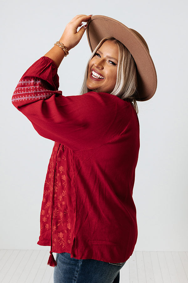 Turn heads in our adorable plus size dark red 'Tavern Nights' shift top featuring lightweight material patterned with subtle embroidered floral detailing, a tie closure v-cut neckline, loose long sleeves, and a relaxed silhouette that falls into a straight hemline!