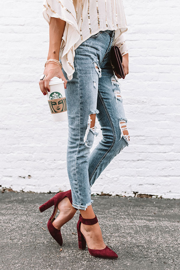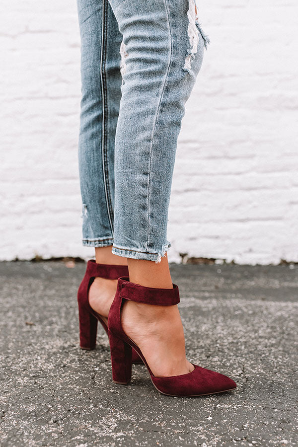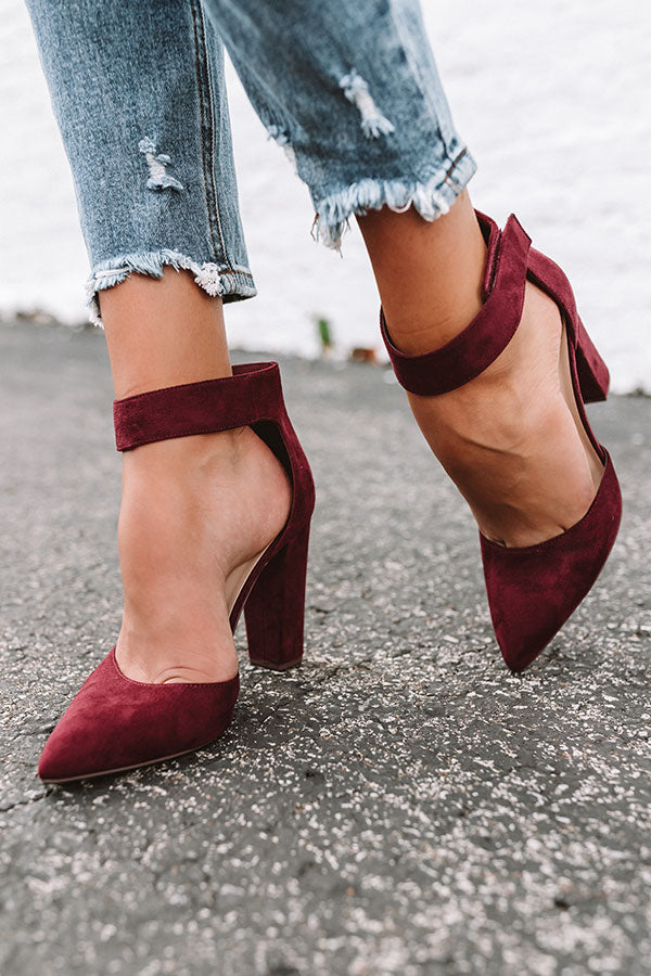 Step up your fall shoe game with "The Brinkley" featuring wine colored faux suede material, a t-inch block heel, a velcro ankle strap, and a pointed closed toe!