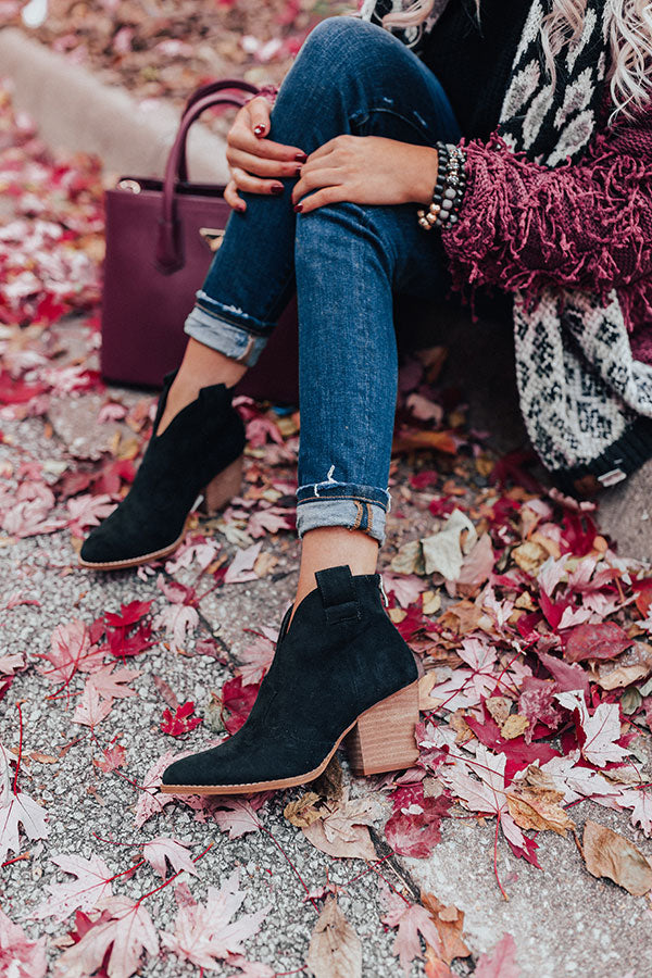 Step into fall in style with our black "Corey" bootie featuring faux suede material, pointed closed toes, 3-inch block heels, and a v-notched accent with handle tabs!