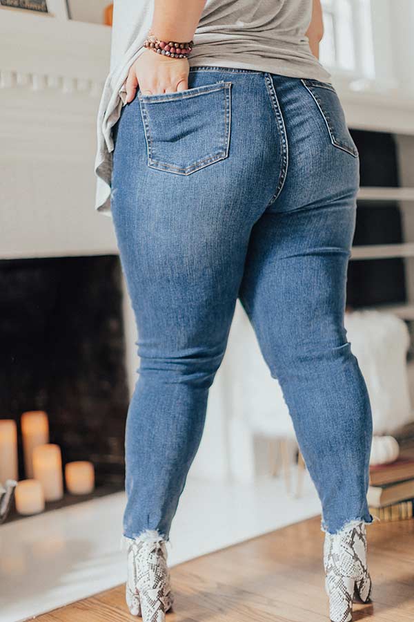 Plus Size - Life is more than just fitting into your jeans, but we believe you will LOVE the feel and look of "The Elliot" bottoms with their skinny form fit, medium wash colored denim, high waistband, frayed ankle hems, 5 pocket cut, belt loops, and a hidden zip with a button closure! These edgy bottoms will take you from season to season when you wear with your favorite strappy sandals and tank top in the summer and with booties and a sweater in the fall!