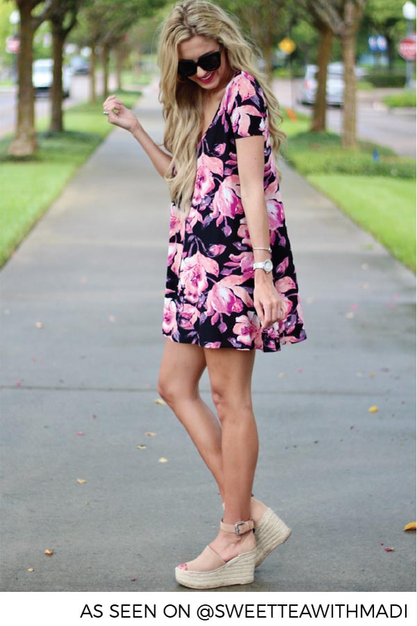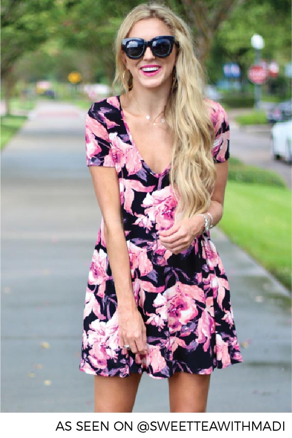 We are absolutely smitten with this fabulous floral! This sweet & sassy jersey knit shift dress features short sleeves, a v-cut neckline, hidden side pockets & a breezy swing skirt. Pair with your favorite wedges for the ultimate patio party look!