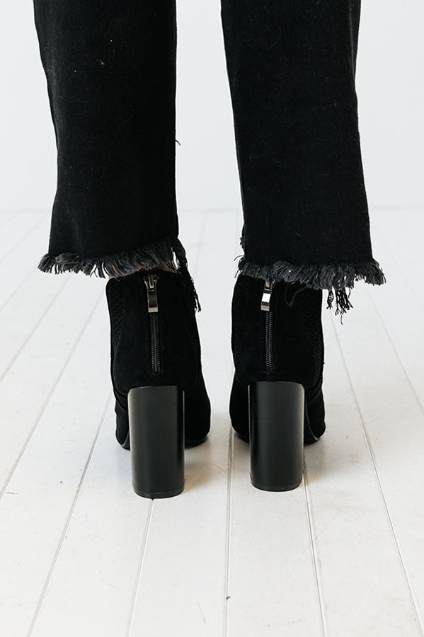 The perfect shoe staple just landed! Our chic black 'Mable' bootie features a flirty peep toe, a 3.5-inch block heel, a zip closure heel, and two v-notches for additional comfort! This bootie runs more true to size.