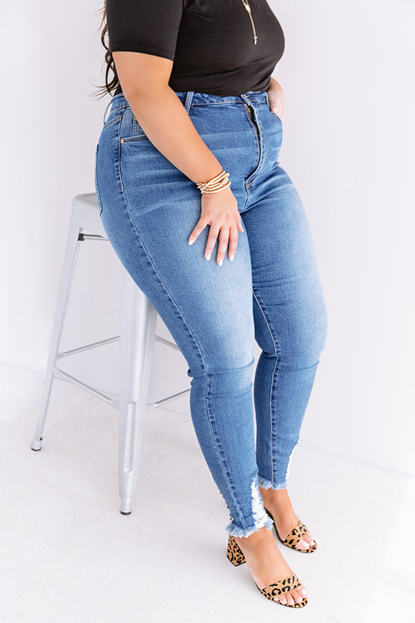 Plus Size - These pants are sure to fit you in all the right places, as they should! The "Shea" bottoms feature medium wash denim with subtle accent fading, distressed detailing, a mid-rise stretchy fit, a skinny pant leg with ankle-length hems that can be cuffed, a classic 5-pocket cut with belt loops, a hidden zip fly, and button closure! These edgy bottoms will take you from season to season when you wear with your favorite strappy sandals and tank top in the summer and with booties and a sweater in the fall!
