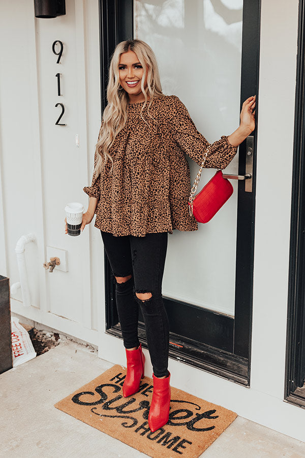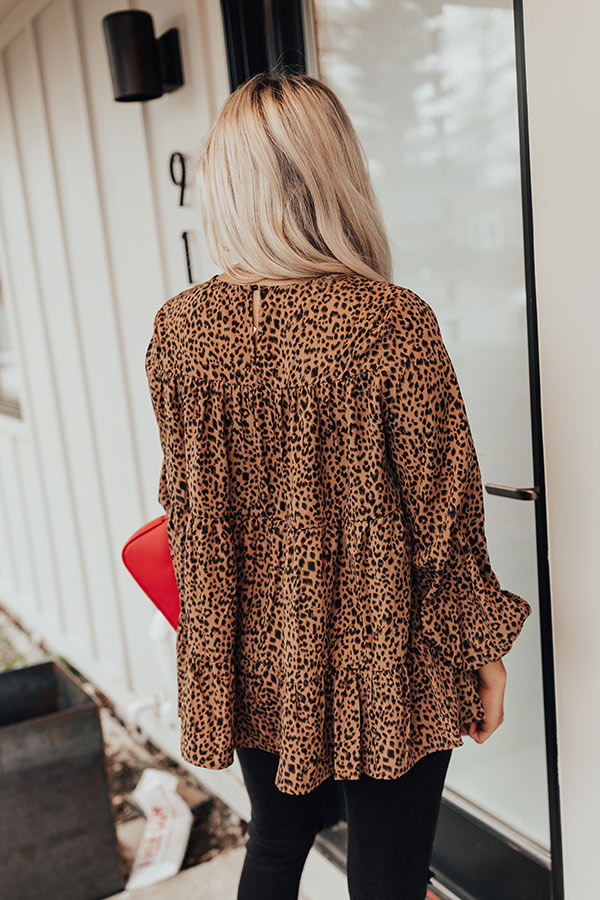 You will be too sweet to handle when you wear this adorable mocha hued top featuring lightweight material patterned with a black leopard print, a high rounded neckline, long loose bubble sleeves, a keyhole accented upper back with a button closure, and a relaxed tiered silhouette that falls into a straight hemline! Measurements