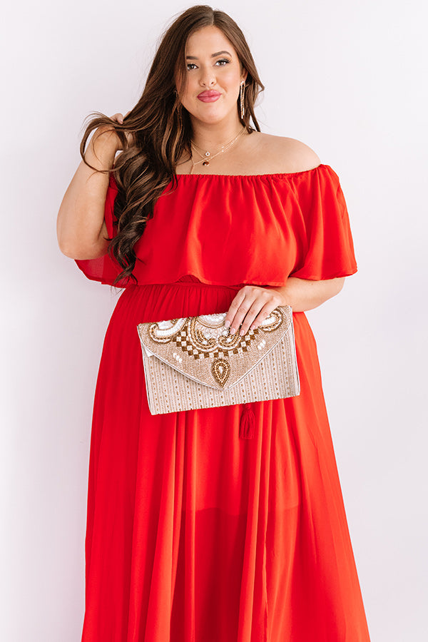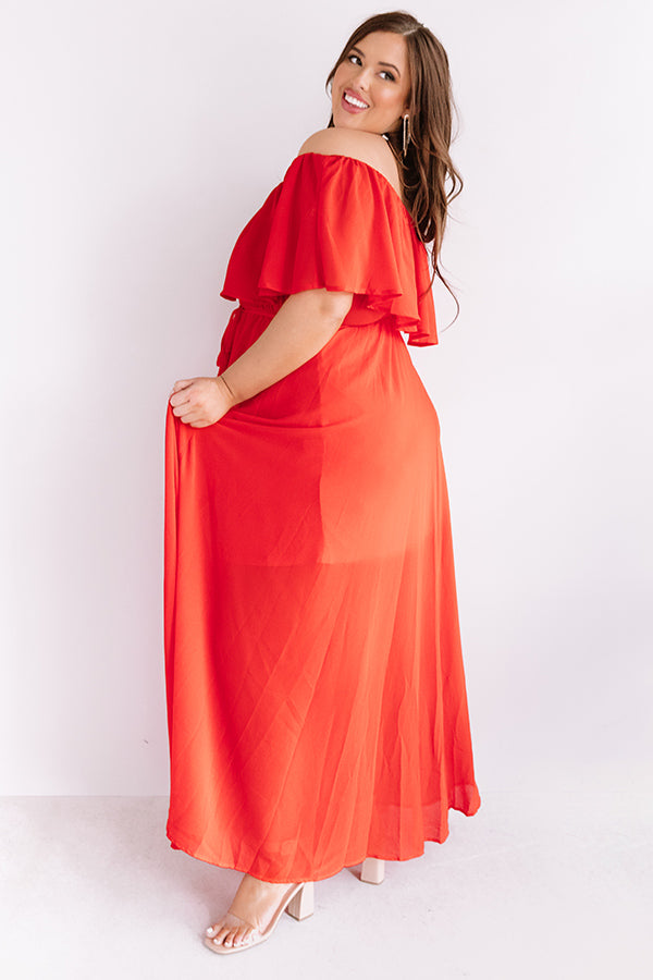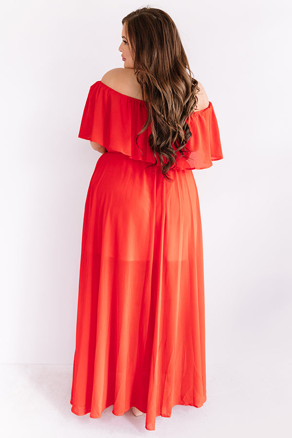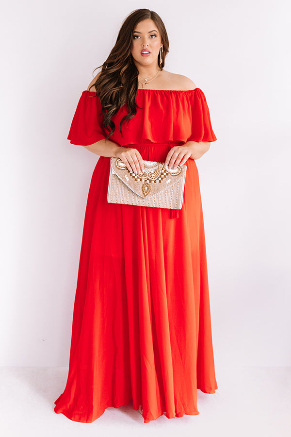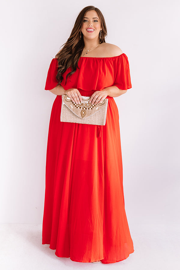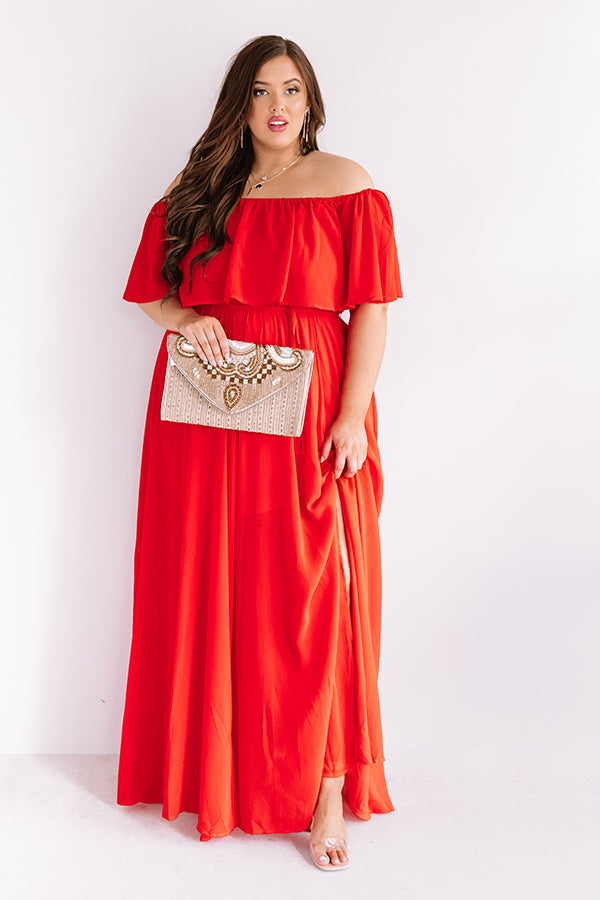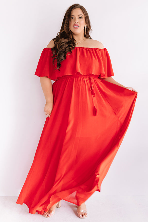 Plus Size - Whether its date night or a relaxed summer evening with friends, our gorgeous red hot "Top Of The Hour Maxi" is the perfect wear anywhere piece! It features chic lightweight material, an elastic off-shoulder fit, a straight neckline with a short sleeve bodice overlay, a cinched waistline with a tie belt, and an ultra relaxed semi-sheer skirt silhouette that falls into a straight floor-length hemline with accent thigh-high side slits! We have styled this stunning dress with some neutral clear strap heels and an embellished clutch, but you can also wear it with the "Steve Madden Gigi Ankle Strap Rhinestone Heel" and our rhinestone "Subtle Shine Beaded Headband!" Measurements