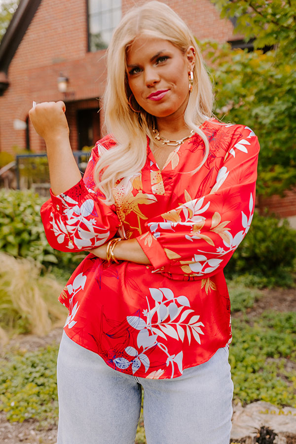 Strike a pose in our photo-worthy red plus size 'Valencia Vibes' top featuring lightweight satin material patterned with a mustard and light blue floral print, a v-cut neckline, long loose sleeves, and a relaxed silhouette that falls into a rounded hemline!