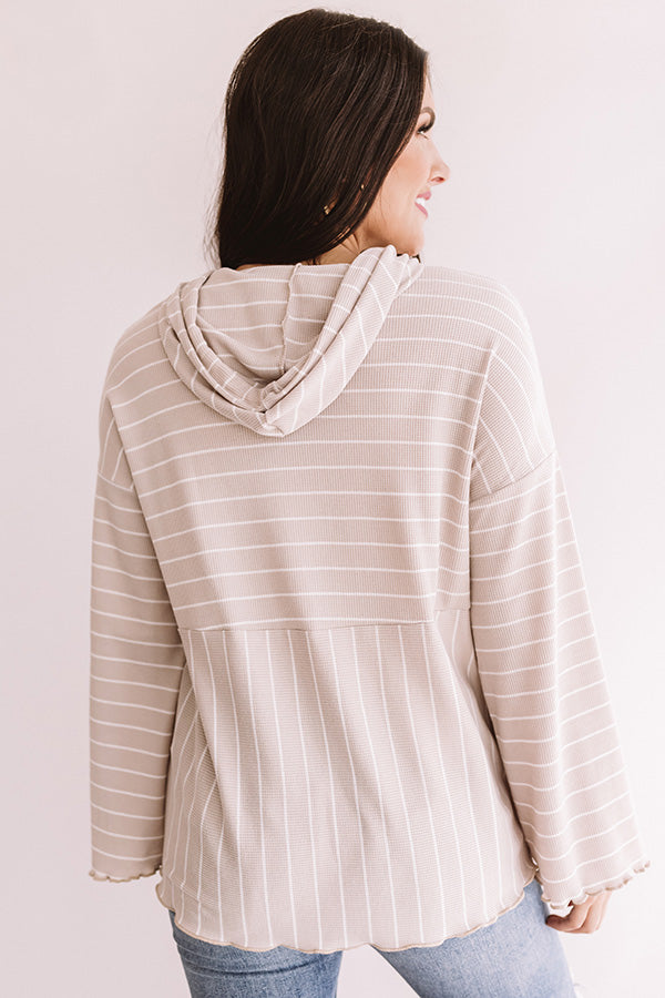 You are sure to feel like you are getting a "warm embrace" when you wear this iced latte shift sweater featuring white stripes, a lightweight subtly ribbed material, long loose sleeves with ruffle trim flared cuffs, a hooded back with a tie string closure, and a relaxed babydoll fit that falls into an uneven hemline! You can style this piece up with some distressed ankle skinnies, a neutral cutout wedge, and a colored backpack, or you can dress it down with some white shorts, "The Karter Faux Suede Sneaker in Birch" and our "All Caught Up Headband in Ivory!" Measurements