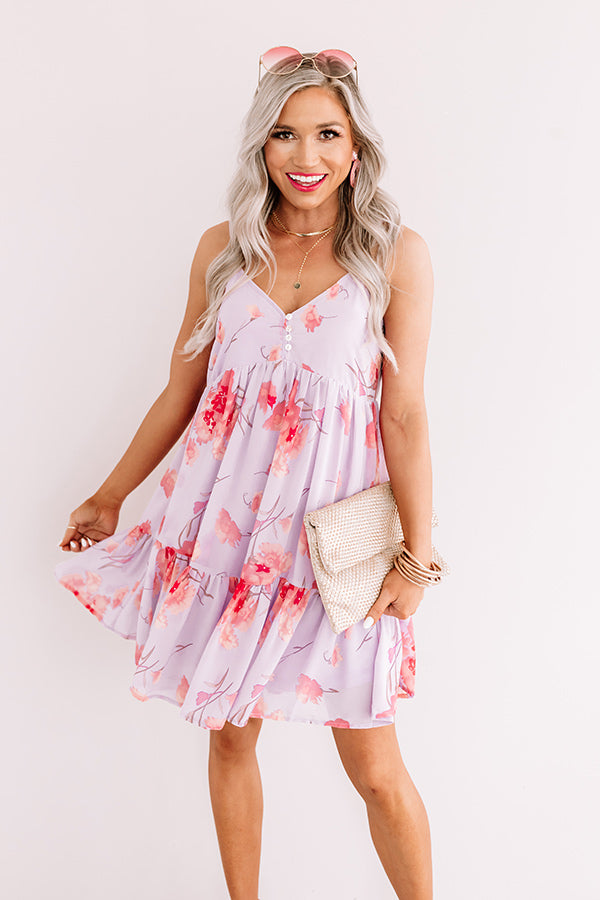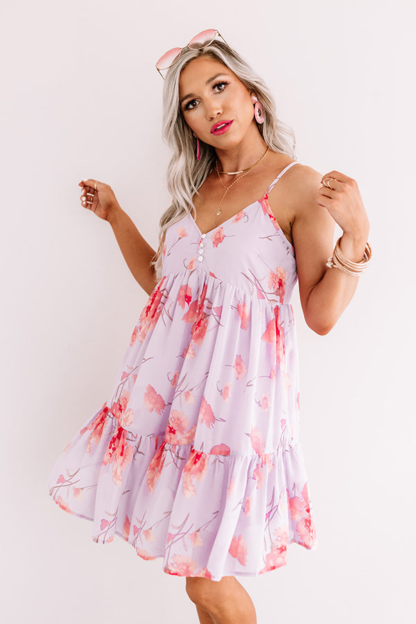 Step up your summer style game with our adorable light purple "Waterfall Romance" dress featuring lightweight breezy material with a pink hued floral print, a button up bodice with a v-cut neckline, adjustable spaghetti straps, and an ultra relaxed babydoll silhouette that falls into a wide peplum bottom with an uneven mid-thigh length hemline! We have styled this flirty piece with a gold clutch and a matching pair of wedges, sunnies, and statement earrings, but you can also wear it with "The Carolina Heel in Gold" and our gold "Spread Your Wings Butterfly Hair Clip Set!" Measurements