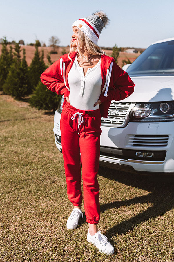 Don't let the chilly winter weather cool down your style with these trendy red joggers featuring soft lightweight material, a wide elastic waistline with a tie belt closure, and a slouched pants silhouette that tapers into fitted ankle-length hemlines! Measurements