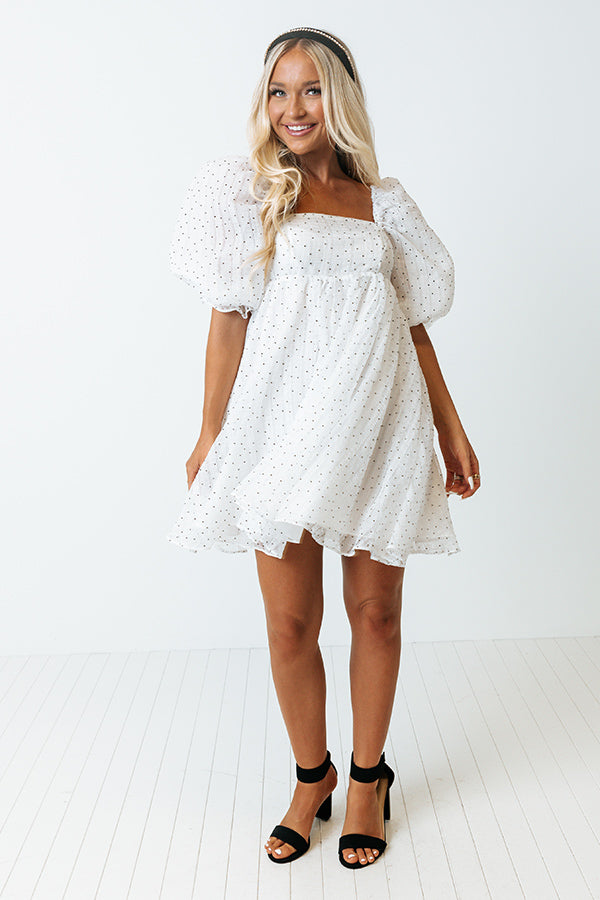 You will look so classy yet effortlessly casual in this darling little white dress featuring lightweight material patterned with small black polka dots, a straight neckline and upper back, oversized puff half sleeves, and an adorable silhouette that falls into a straight mid-thigh length hemline!
