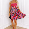 - Fully lined material with a floral print featuring greens, purples, reds, and oranges