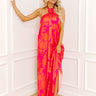 - Unlined material with hot pink and red hued floral print and a satin finish