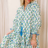 - Flowy and fabulous, this floral mini dress is your go-to for effortless style! Its relaxed fit keeps things easy-breezy, while the delicate ruffle detailing adds a playful touch. Perfect for brunch dates, casual outings, or any moment that calls for a sweet, stylish vibe. - Lightweight material with a blue and green colored floral print - A built-in skirt lining - A v-cut neckline with ruffle detailing and a tie featuring sky blue colored accent tassels - Green ricrac trim - Long sleeves with elastic ruffle cuffs - Hidden side pockets - A flowy, relaxed silhouette that ends in a ricrac trimmed, mini dress length hemline