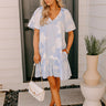 - Brunch date or girls' day out, this sweet floral dress has you covered! Cute, flirty, and ready for wherever the day takes you. - Fully lined material with a white and blue hued floral print - A v-cut neckline - Short sleeves with gathered detailing on the shoulders - Hidden side pockets - Horizontal pleated accents on the skirt - A relaxed silhouette that ends in a subtly ruffled hemline