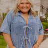- Denim meets chic in this must-have top! The front tie detail adds a flirty touch, making it your go-to for creating effortless, on-trend outfits.