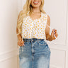 Plus Size - Slay all day in our charming white 'Drifting Into Dreams Shift Top' featuring lightweight breezy material patterned with a small light orange floral print, a v-cut neckline with a ruffled tie closure, wide shoulder straps, and a relaxed silhouette that falls into a straight hemline!