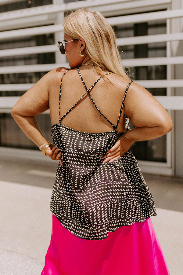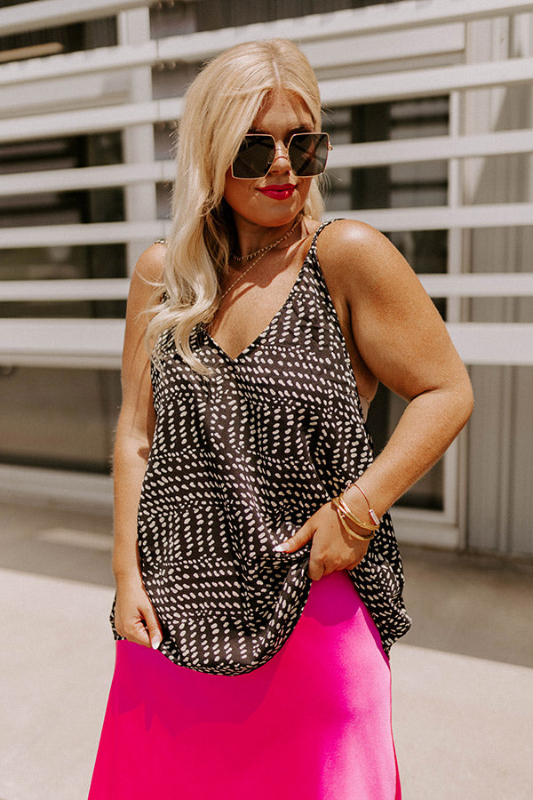 Perfect for layering or wearing solo, our versatile black plus size 'Feel The Beat Shift Tank' features lightweight material patterned with a spotted print, a v-cut neckline with four spaghetti straps, and a relaxed silhouette that falls into a straight hemline!