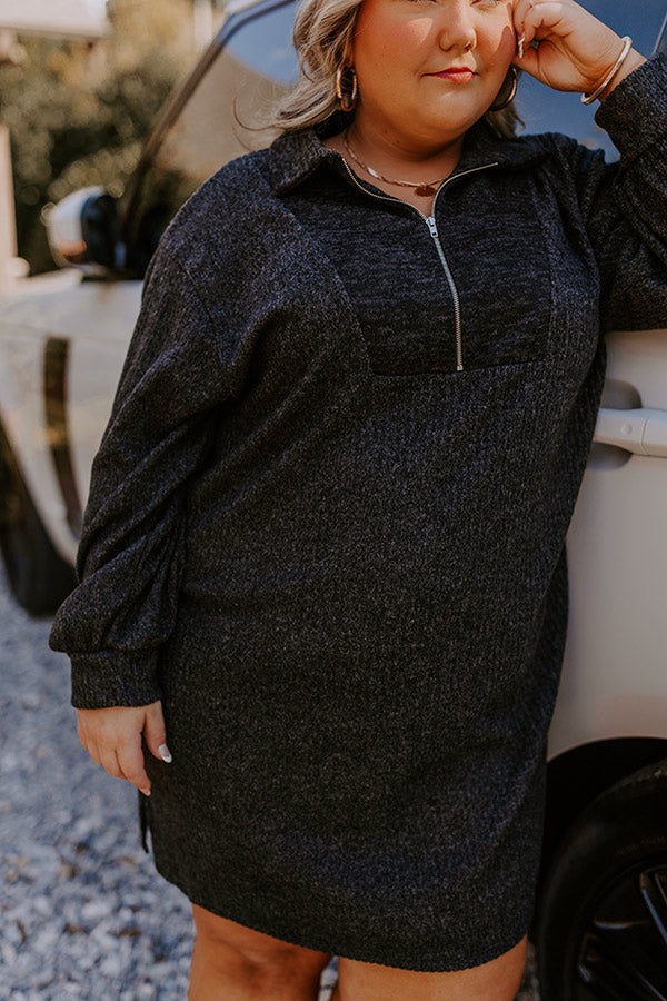 - Stay chic this season in our adorable knit mini dress! The zippered neckline adds a playful touch, giving your everyday look a trendy twist. Perfect for laid-back days or casual outings, this dress is your go-to for effortless style. Keep it fabulous and fashionable all season long! - Unlined heather black colored knit material with a ribbed texture - A zippered v-cut neckline with a collared back - Long sleeves with fitted ribbed cuffs - Hidden side pockets - A relaxed yet flattering silhouette that ends in a straight hemline with side slit accents