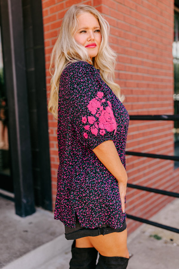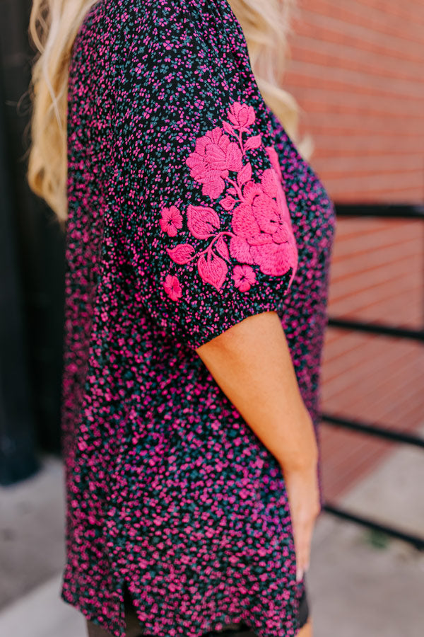 - Short puff sleeves with elastic cuffs and floral embroidered detail
