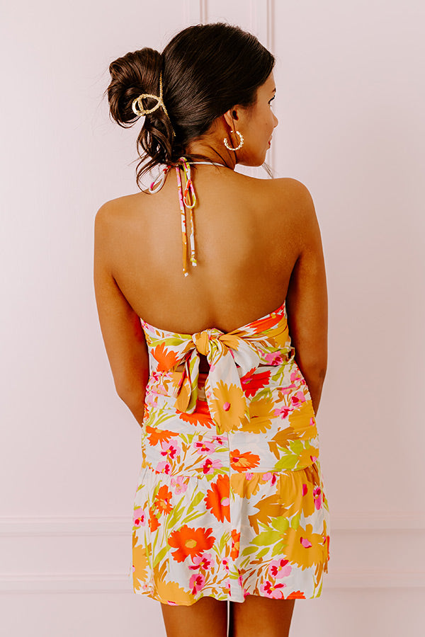 You will have a round trip ticket to style when you add this adorable dress to your wardrobe! It features lightweight smocked material patterned with a red/coral, orange, pink, and light green floral print, a halter tie neckline with a sleeveless fit, a tie closure in the back, a front mid-riff cutout, and a flattering figure hugging skirt silhouette that ends in a straight mid-thigh length hemline!