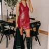 - Go for a modern aesthetic with this trendy mini dress! With its timeless cut and faux leather material, it puts an edgy twist on classic style.