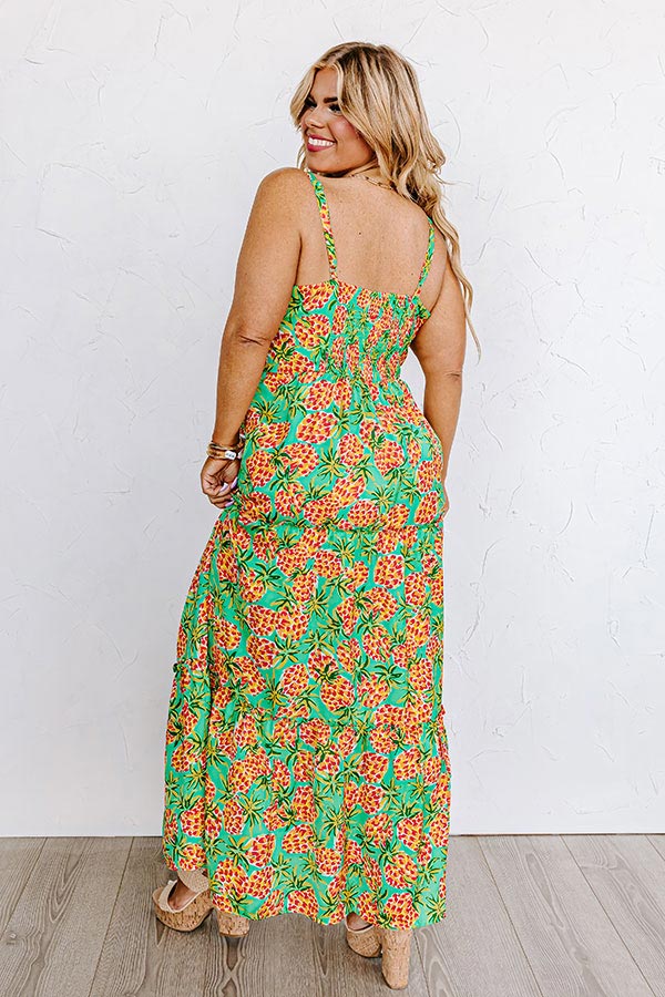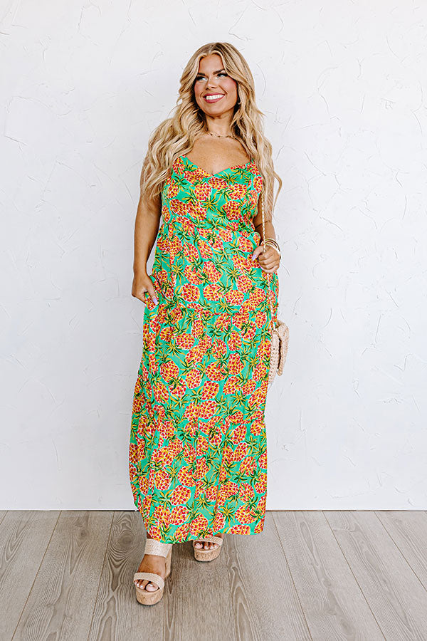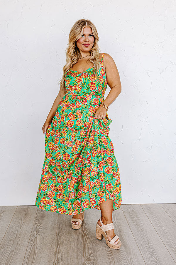 You are sure to look sassy yet sweet in this adorable kelly green plus size maxi dress featuring lightweight material patterned with an orange and dark green floral print, a v-cut neckline with thin adjustable spaghettis traps, and a relaxed tiered silhouette that cascades into a straight ankle-length hemline!