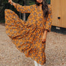 - Airy chiffon material with an abstract print featuring browns, red, yellow, and green hues and a built-in lining