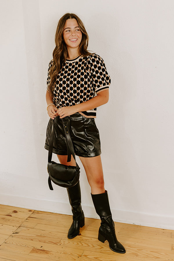- A little polish and a little playful, this knit top brings it all together with a charming geometric design! It's a versatile statement piece for your denim days or mini skirt moments! - Unlined knit material with a geometric design featuring cream, black, and iced latte - A crew cut neckline - Short puff sleeves with thin ribbed cuffs - A relaxed silhouette that ends in ribbed waistband
