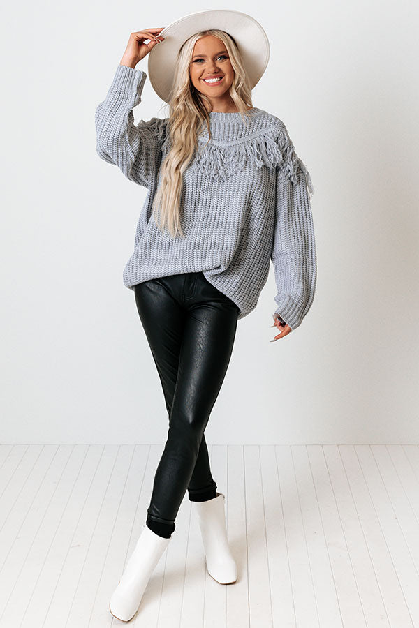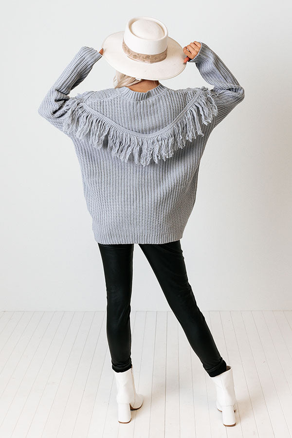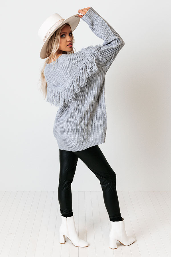 Make a fun statement with our adorable airy blue 'Idlewild' sweater featuring soft and warm knit material with fringe detailing around the bodice and upper arms, a rounded neckline, long loose sleeves, and a slouched silhouette that falls into a straight hemline!