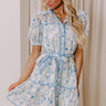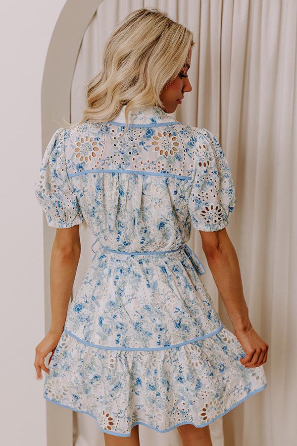 - Make a charming impression with this darling mini dress! Perfect for embracing floral season, this cutie has sweet eyelet material and a flattering belted waistline to keep you looking fabulous. - Eyelet material with cream colored embroidery featuring a pear, and blue hued floral print - Blue hued accent trim - A built-in lining - A collared neckline - A buttoned front - Belt loops and a removable tie closure belt - Short puff sleeves with elastic cuffs - A flattering silhouette that ends in a mini dress length hemline
