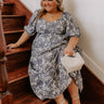 - This beautiful floral midi is all about charm and elegance, making every moment feel extra special! With its fabulous floral paisley design and flowing fit, it's the perfect piece to add a dash of sweetness to your day. - Denim colored floral jacquard material - A built-in skirt lining - A v-cut neckline with an elastic back - Short puff sleeves with elastic cuffs and elastic cuffs - A waistline with an elastic back - Hidden side pockets - A flowy and flattering silhouette that ends in a straight midi length hemline