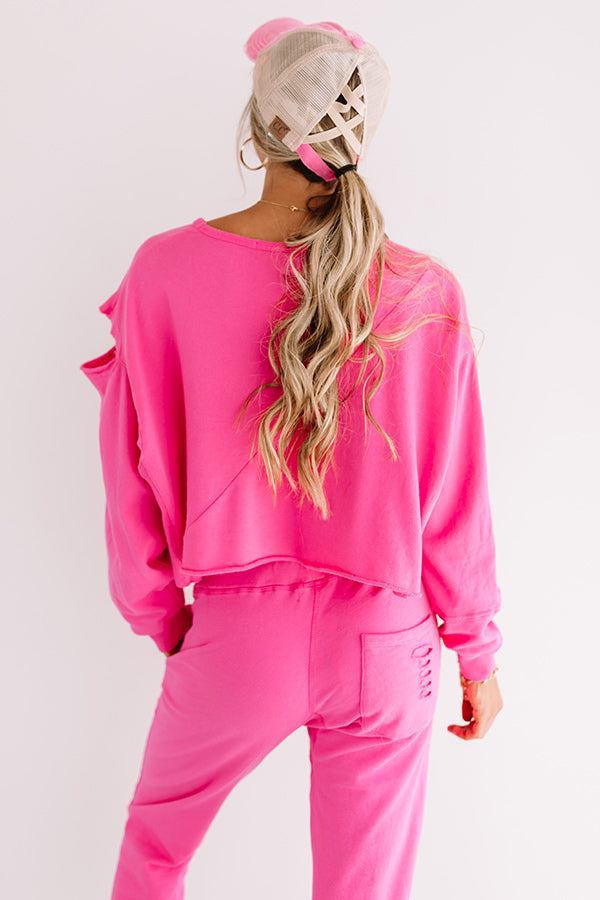 There isn't a better piece to wear when it's a little chilly than this adorable pink sweatshirt featuring ultra soft lightweight material with distressed detailing, a wide rounded neckline, oversized sleeves with fitted cuffs, and a relaxed silhouette that falls into a straight cropped raw-cut hemline!