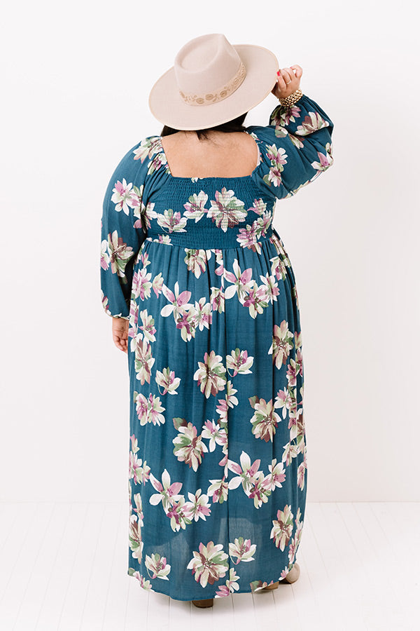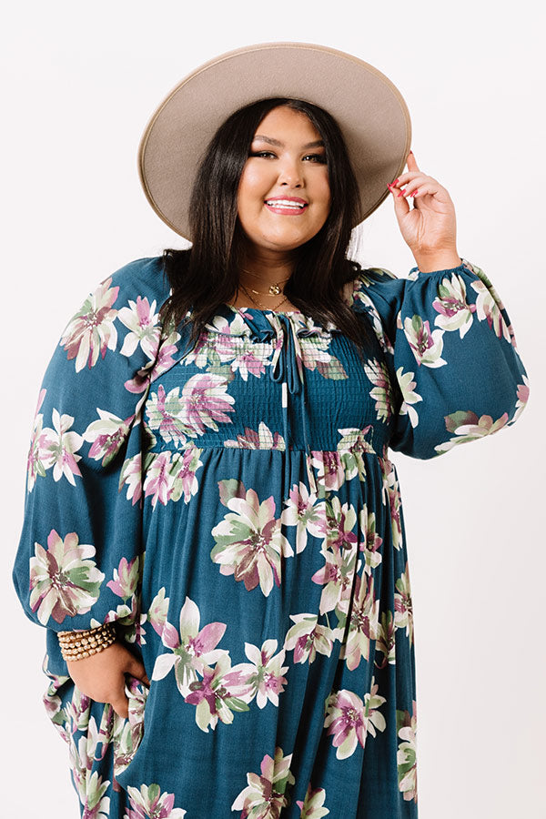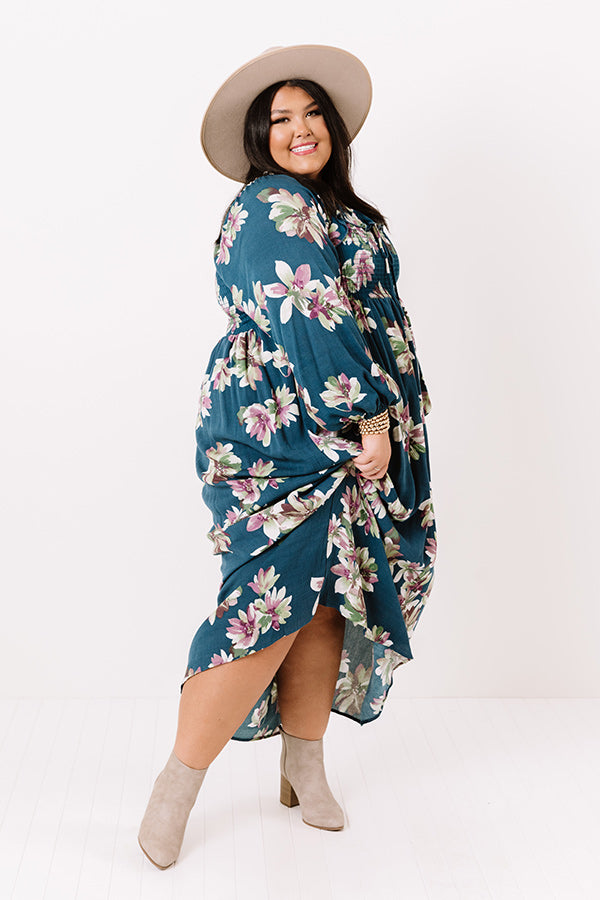 Plus Size - We have no doubt you will absolutely adore this stunning teal hued maxi featuring lightweight breezy material patterned with a large wine, cream, blush, and green hued floral print, smocked detailing around the bodice with ruffled trim detailing and a tie closure, a high neckline that can be worn on or off the shoulder, long bubble sleeves, and an ultra draped silhouette that cascades into an uneven floor-length hemline! Measurements
