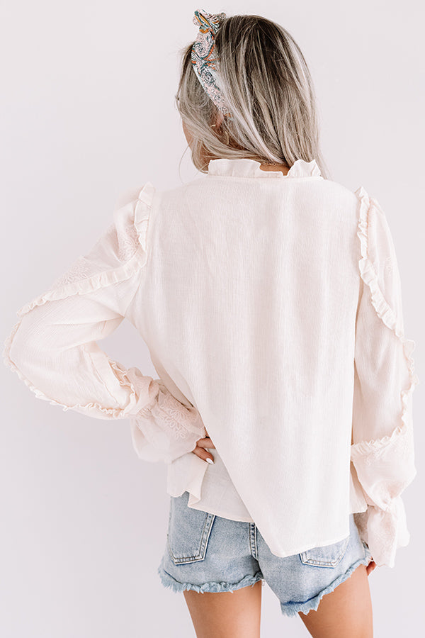 You are sure to receive "all the compliments" when you wear this adorable neutral hued top featuring lightweight material, a v-cut neckline with a tie closure, long loose bubble sleeves with flared cuffs, ruffled and crochet detailing throughout, and a relaxed silhouette that falls into a straight hemline! We have styled this charming piece with some distressed denim shorts, a matching hair scarf, and a stone colored wedged bootie and faux leather crossbody, but you can also wear it with some black flares and the "Cosmic Leather Heel!" Measurements