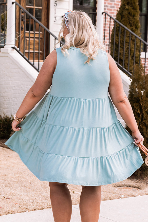 Plus Size - Level up your transitional wardrobe with our charming ocean wave colored 'Apple Spiced Wishes' dress featuring lightweight material, a high rounded neckline, wide 3-inch sleeveless shoulder straps, and a relaxed tiered babydoll silhouette that falls into an uneven lower-thigh length hemline! Measurements