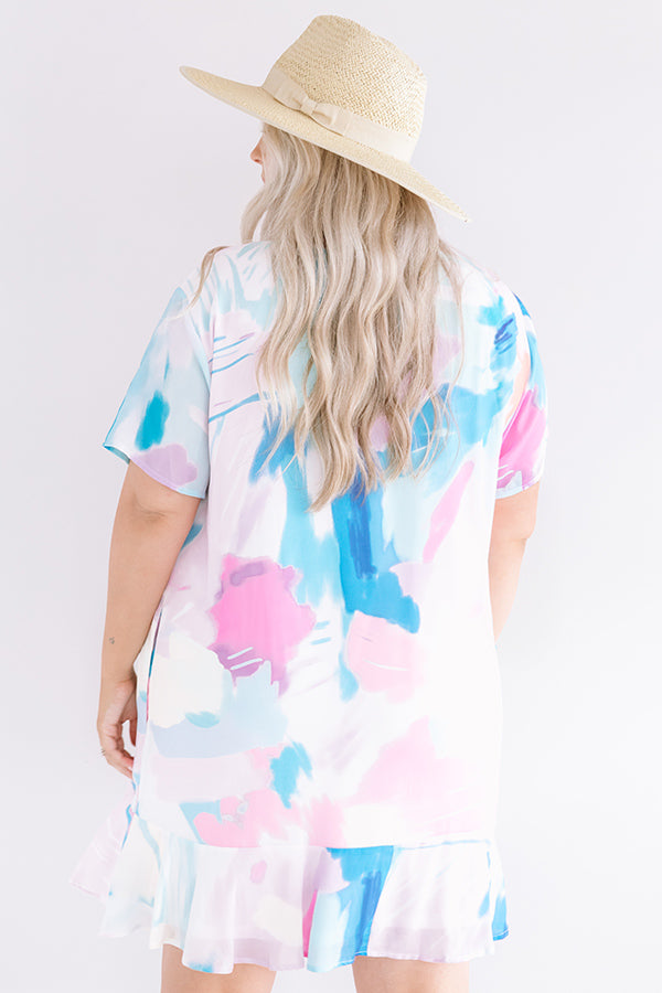 Plus Size - There is no reason your shouldn't add this eye-catching shift dress to your cart with its lightweight breezy material, abstract ocean blue and pink hued pattern, v-cut neckline, short loose sleeves, and relaxed silhouette that falls into a peplum bottom with an uneven mid-thigh length hemline! We have styled this unique piece with a woven block heel, tote, and hat, but you can also wear it with "The Bowen Wedge in Blue!" Measurements