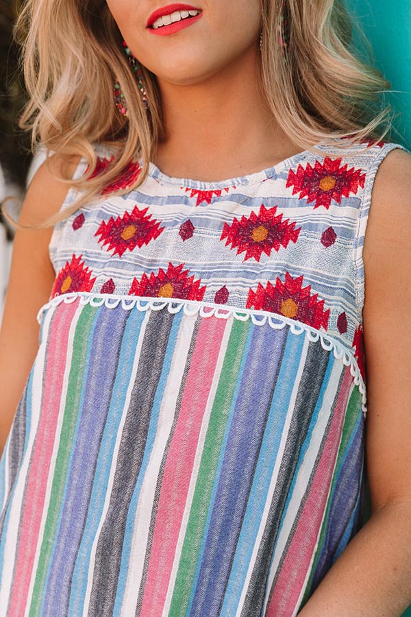 You won't find a better piece to wear to a "boardwalk brunch" than this charming shift dress featuring lightweight material patterned with colorful vertical accent stripes and a red aztec print on the upper bodice, a high rounded neckline, wide 2-inch shoulder straps, a keyhole accented upper back with a button closure, hidden side pockets, and a relaxed silhouette that falls into a rounded mid-thigh length hemline! This cutie styles perfectly with some brown heels, or it can be worn with "The Lyla Sandal in Red!"