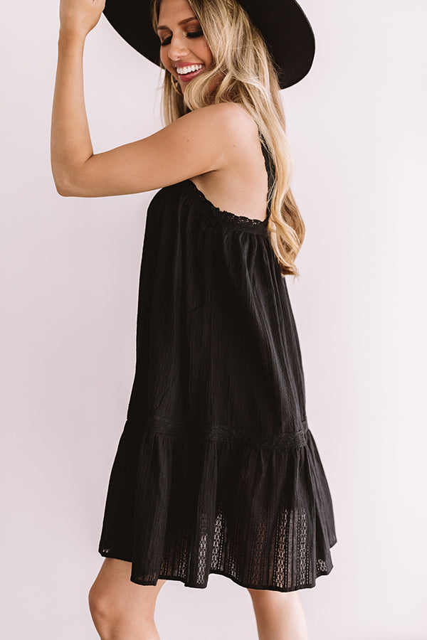 Show up to "Brooklyn happy hour" in style with this little black shift dress featuring lightweight material, 1-inch spaghetti straps, a low open back, lace detailing and subtle crochet detailing, and a relaxed silhouette that falls into a peplum bottom with a mid-thigh length uneven hemline! This piece can be styled for the chillier fall weather under a denim jacket with a faux suede hat, tote, and leopard booties, or you can wear it during warmer days with "The Mia Faux Suede Lace Up Heel in Hot Pink" and our "Paris Lights Earrings in Hot Pink!" Measurements