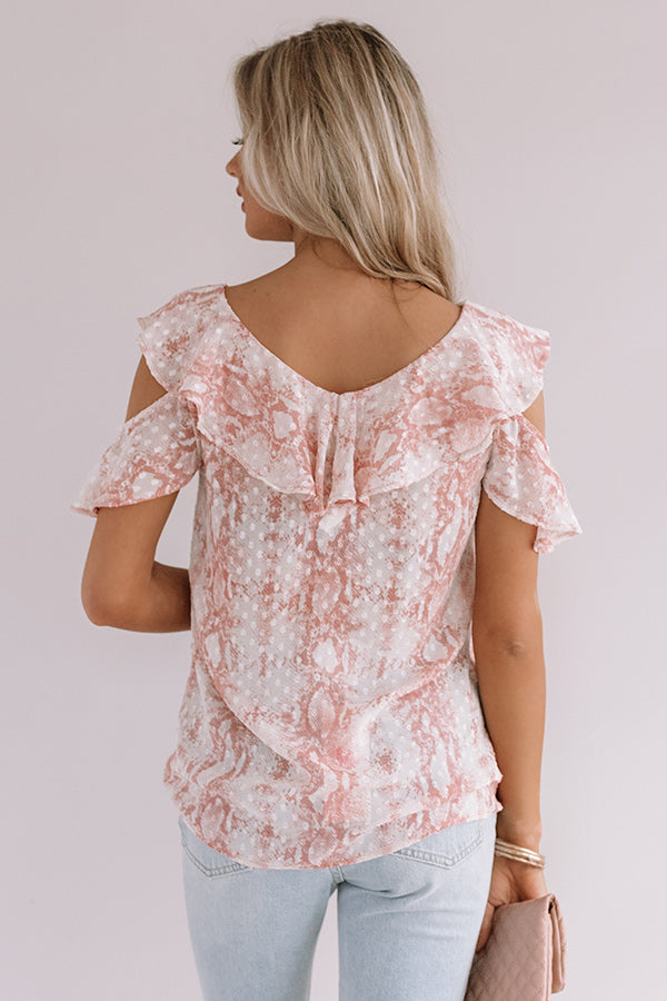 Strike a pose in our adorable "Brunch And Bubbles" top featuring ultra lightweight material patterned with a light pink and white snake print, a wide v-cut neckline and upper back with a ruffled trim overlay, cold shoulder cutouts with flounced arm straps, and a relaxed silhouette that falls into a straight hemline! We have styled this fierce piece with some distressed light wash skinnies, ivory platform heels, and a matching clutch, but you can also wear it with some frayed white shorts, "The Lela Espadrille in Coral," and our "All Caught Up Headband in Ivory!" Measurements