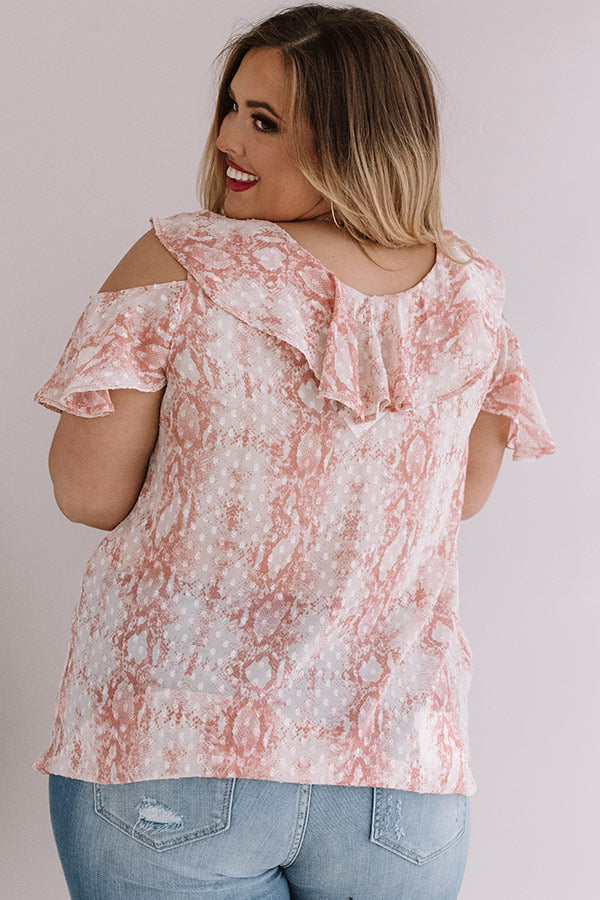Plus Size - Strike a pose in our adorable "Brunch And Bubbles" top featuring ultra lightweight material patterned with a light pink and white snake print, a wide v-cut neckline and upper back with a ruffled trim overlay, cold shoulder cutouts with flounced arm straps, and a relaxed silhouette that falls into a straight hemline! We have styled this fierce piece with some distressed light wash skinnies and a neutral wedge and crossbody, but you can also wear it with some white flares, "The Lela Espadrille in Coral," and our "All Caught Up Headband in Ivory!"