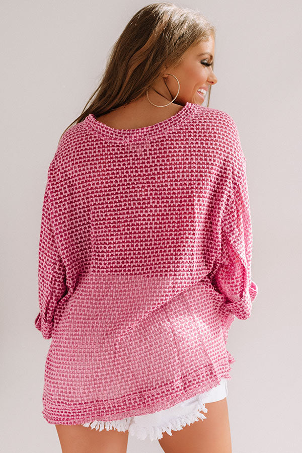 Add a little "cute" to your casual "brunch at the cabin" style with this lightweight pink top features a popcorn knit texture, a round neckline that can be worn off one shoulder, flared mid-length sleeves with rolled cuffs, a breezy box-cut shift silhouette, and a rounded uneven hemline with side slits! Accessorize and add your favorite denim and booties for a transitional look that's perfect for spring, summer, and fall! For additional coverage, we recommend styling with a bralette or cami underneath.