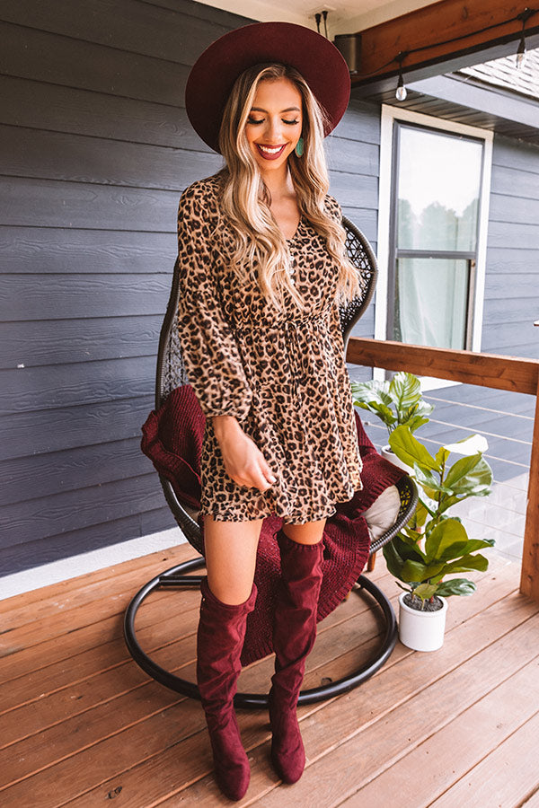 Dress to impress and arrive in style with our adorable brown "Brunch Babe" dress featuring lightweight flowy material patterned with a large black leopard print, a button up bodice with a v-cut neckline, long loose bubble sleeves with fitted elastic band cuffs, a cinched waistline with a tie belt, and a relaxed skirt silhouette that falls into an uneven mid-thigh length hemline! Measurements