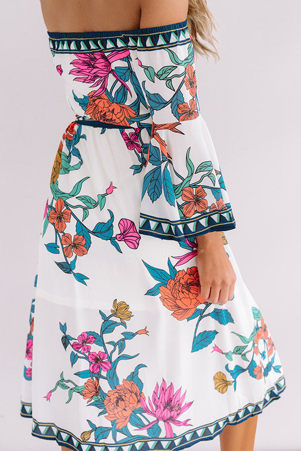 You won't find a cuter piece to wear while enjoying some "bubble with your besties" than this adorable white midi dress featuring lightweight breezy material patterned with a bold and colorful floral print, an off-the-shoulder fit with a straight elastic neckline, form fitting drop sleeves with oversized flared cuffs, a tie belt accent, and a relaxed silhouette that falls into an uneven mid-calf length hemline! We have styled this gorgeous piece with hot pink heels and a woven clutch, but you can also wear it with our orange "Ainsley Wedge" and our hot pink "Jetsetter Chic Hair Scarf!" Measurements