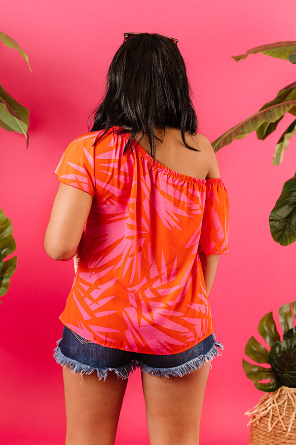 You are guaranteed to be a summer stunner when you wear this flirty hot pink 'Cafe Au Lait"'top featuring lightweight material patterned with a tangerine hued palm leaf print, a diagonal elastic neckline with an attached short sleeve and a single short drop sleeve, and a relaxed silhouette that falls into a straight hemline!