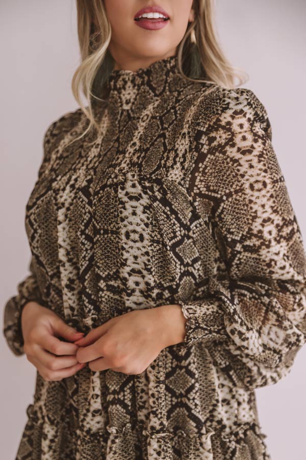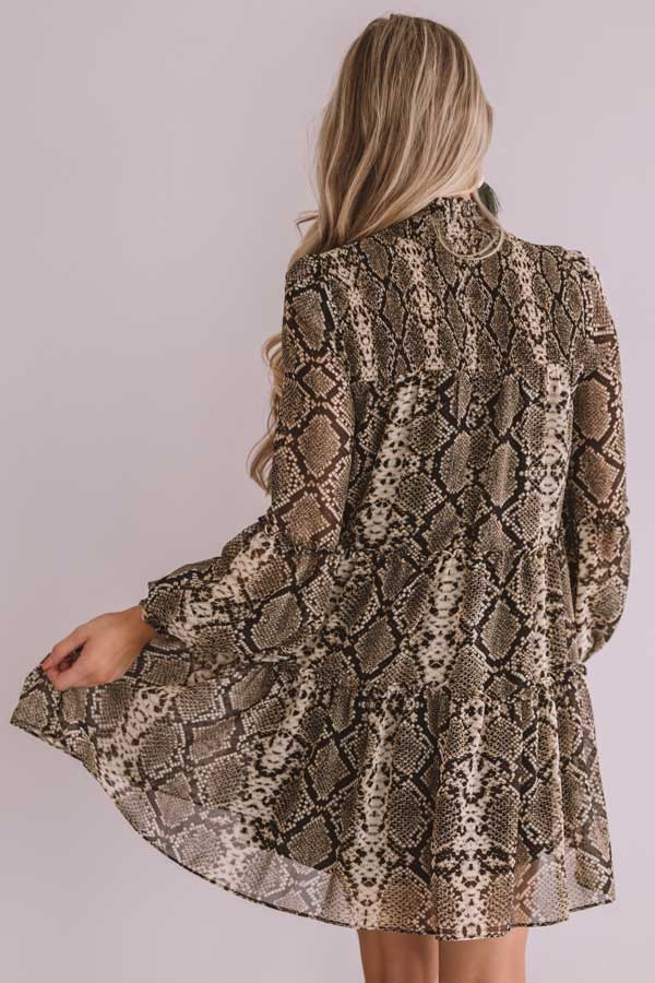 Strike a pose in our adorable "Champagne Showcase" dress featuring lightweight material patterned with a bold black and dark neutral hued snake print, a high turtle neckline, long loose bishop sleeves with fitted smocked cuffs, and a relaxed tiered silhouette that falls into an uneven mid-thigh length hemline! We have styled this chic and flirty piece with some black boots and a dark green clutch, but you can also wear it with colored accessories like our "Plans In Paris Wool Hat in Pink" and "The Theo Heel in Blush!" Measurements