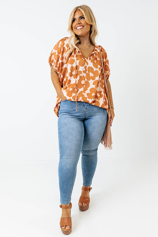 Let your inner flower child show with our adorable plus size 'Chic A La Mode' shift top featuring lightweight material patterned with a bold camel colored floral print, a tie-closure v-cut neckline, loose short sleeves, and a slouched silhouette that falls into a straight hemline!